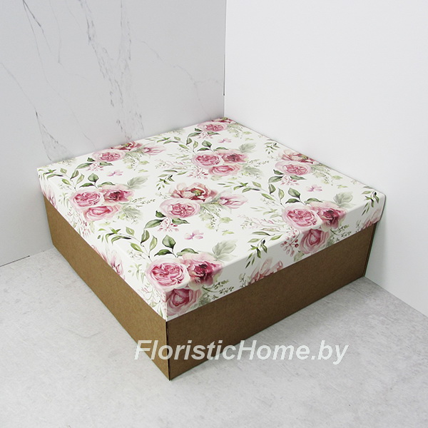 КОРОБКА 25 см х 25 см х 10 см, "Роза Остина" c крафт дном
