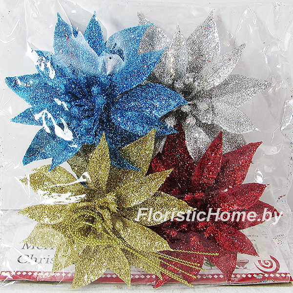 ДЕКОР Набор Пуансеттия в глиттере, 4 шт., 10 см, 0 - в ассортименте